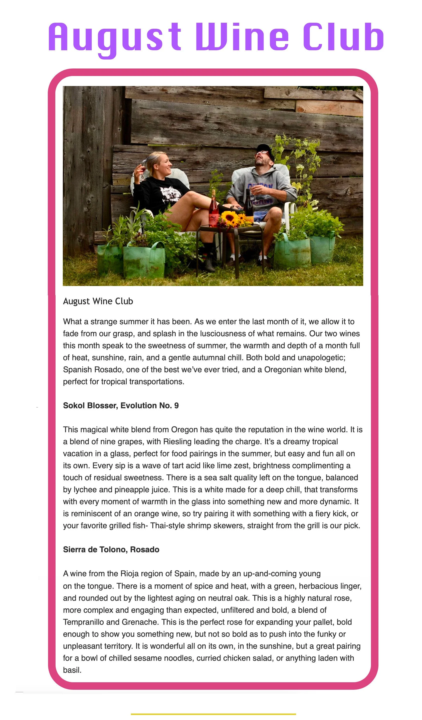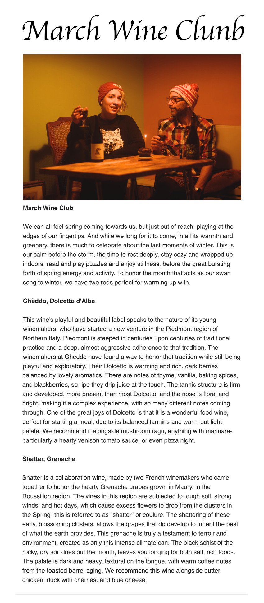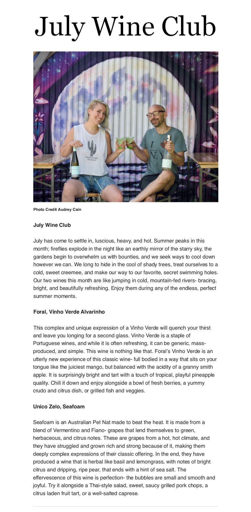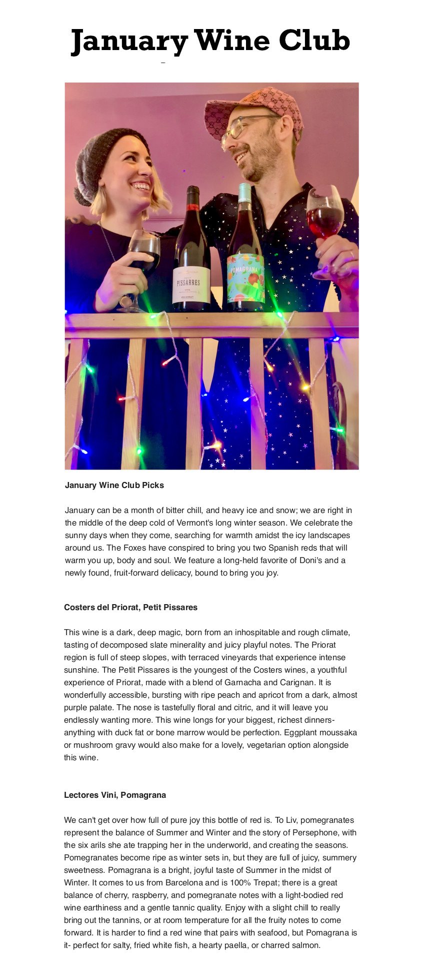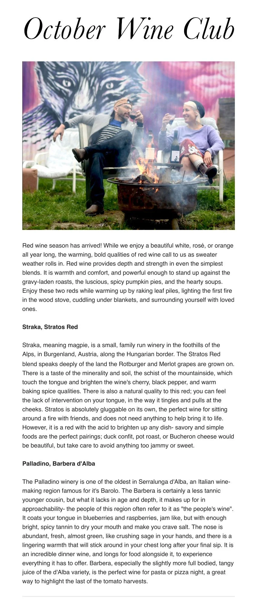 Fox Market Wine Club is a great way people can help support Fox, learn about new wines and enjoy great natural wine. For $40 a month, you will receive two bottles of wine worth at least $40 and 10% off all wines at the market.