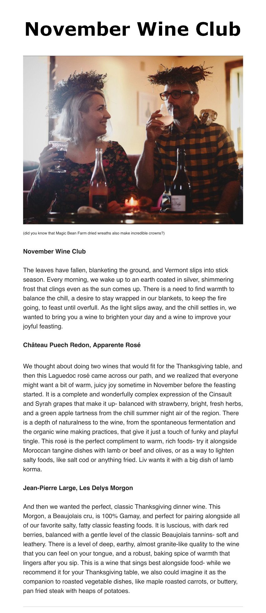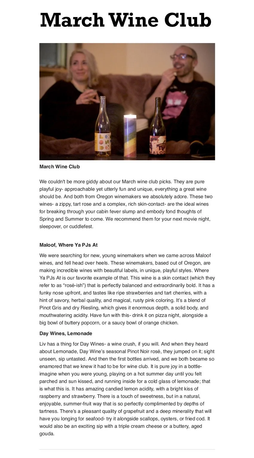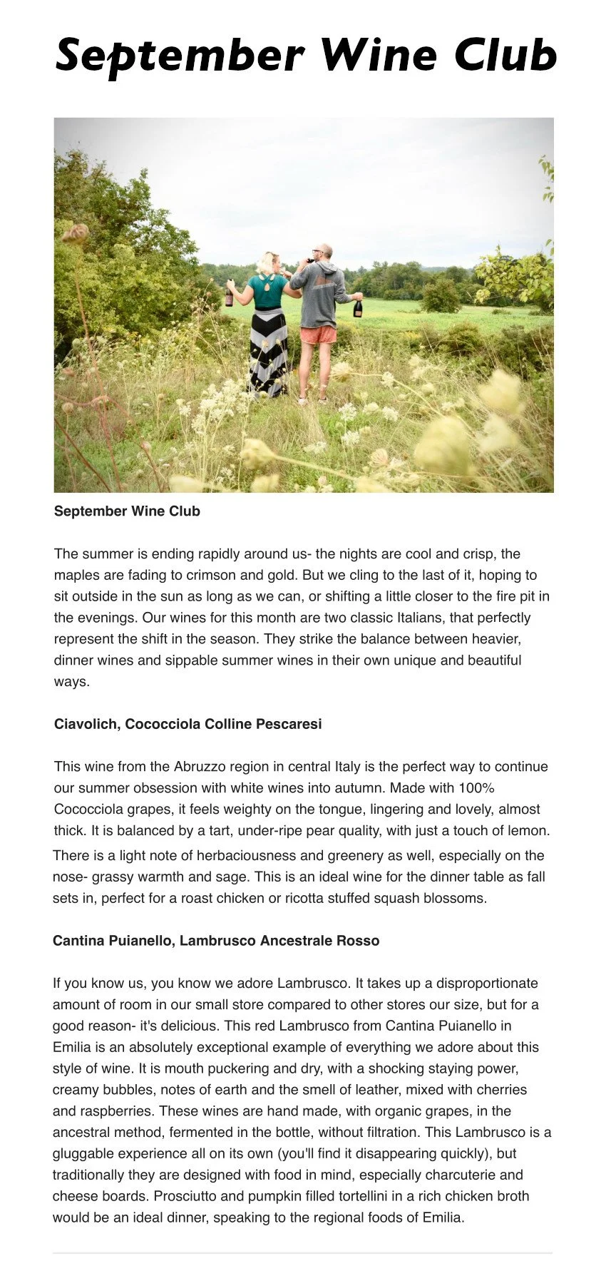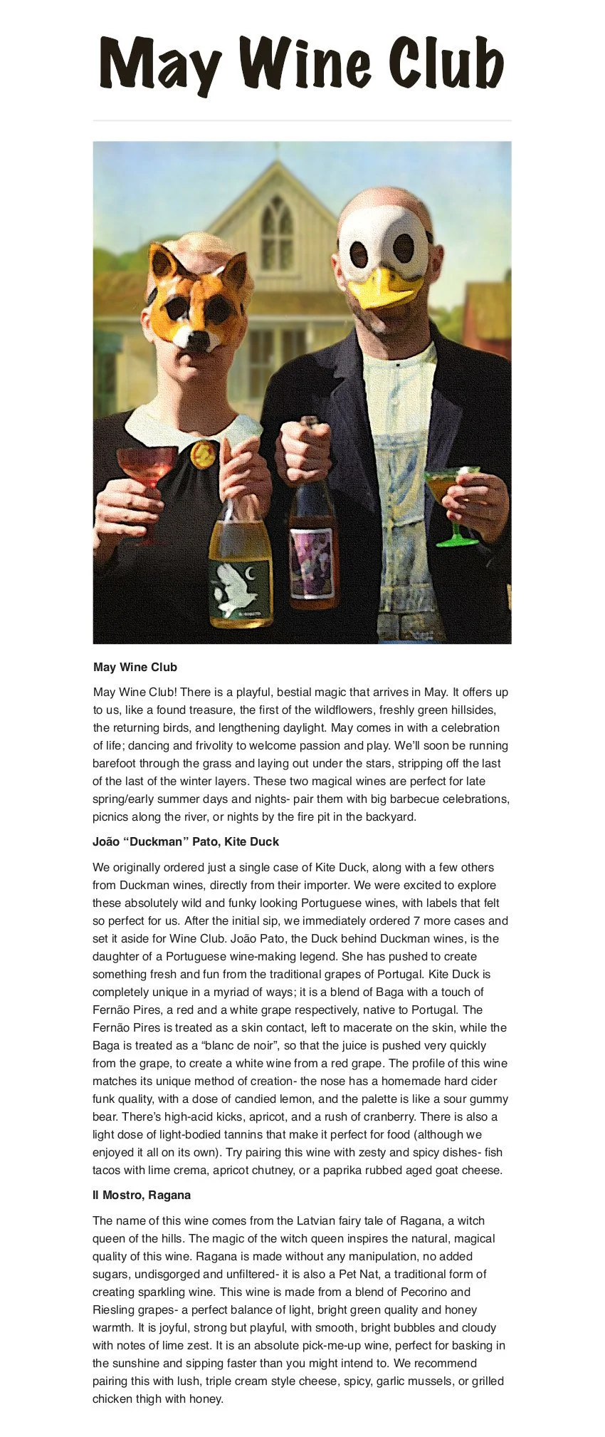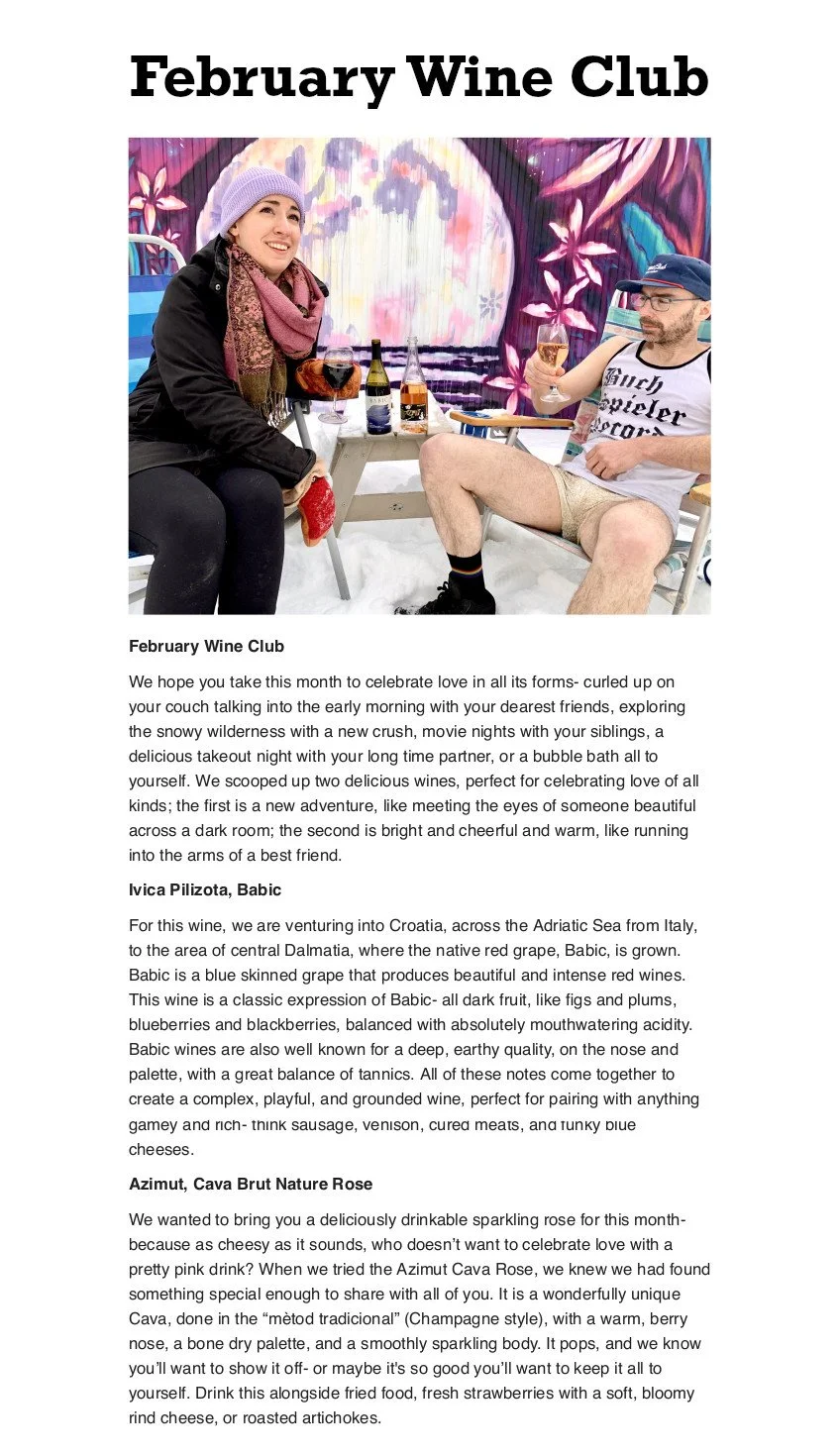 Fox Market Wine Club is a great way people can help support Fox, learn about new wines and enjoy great natural wine. For $40 a month, you will receive two bottles of wine worth at least $40 and 10% off all wines at the market.